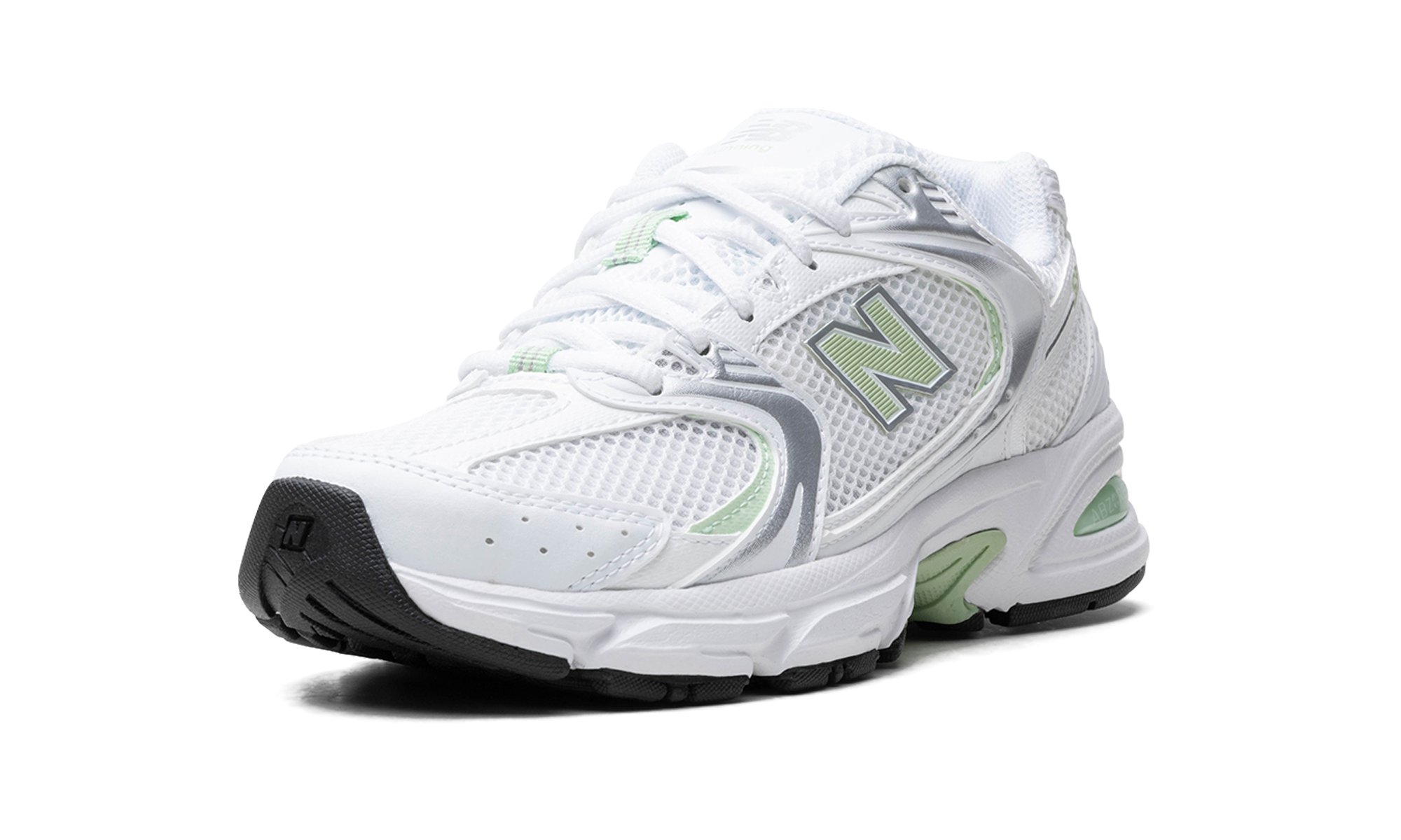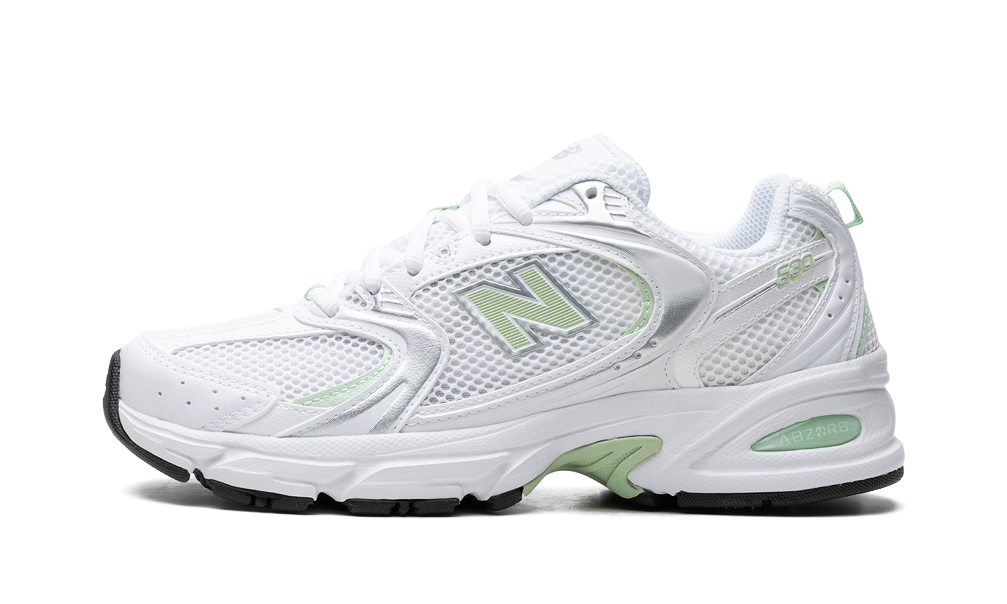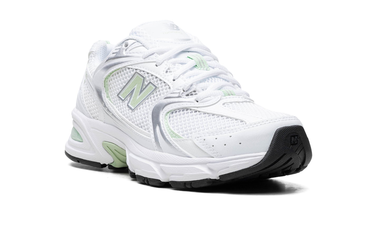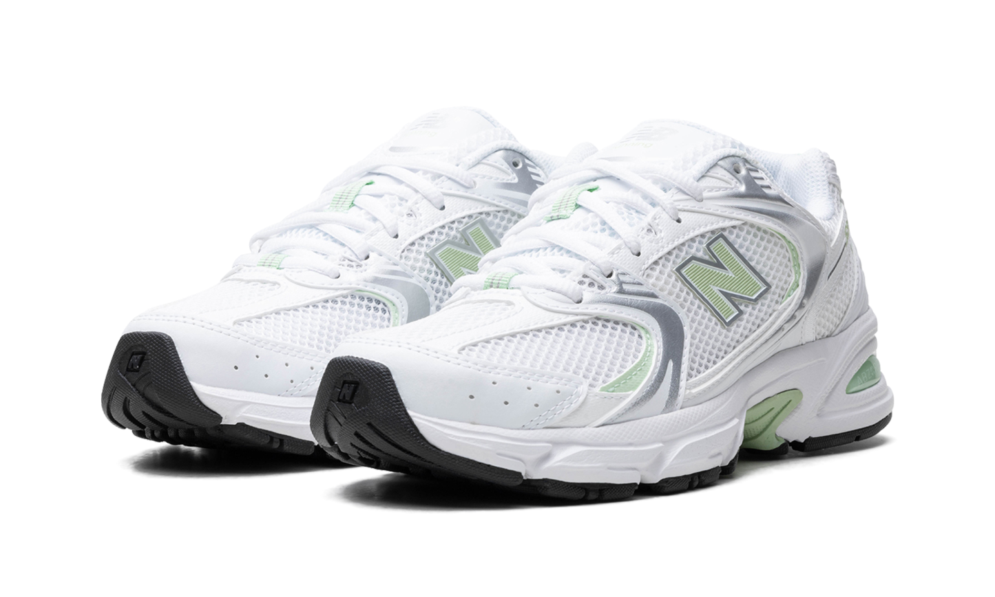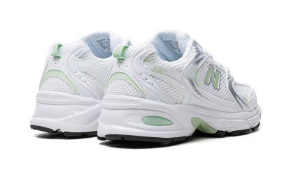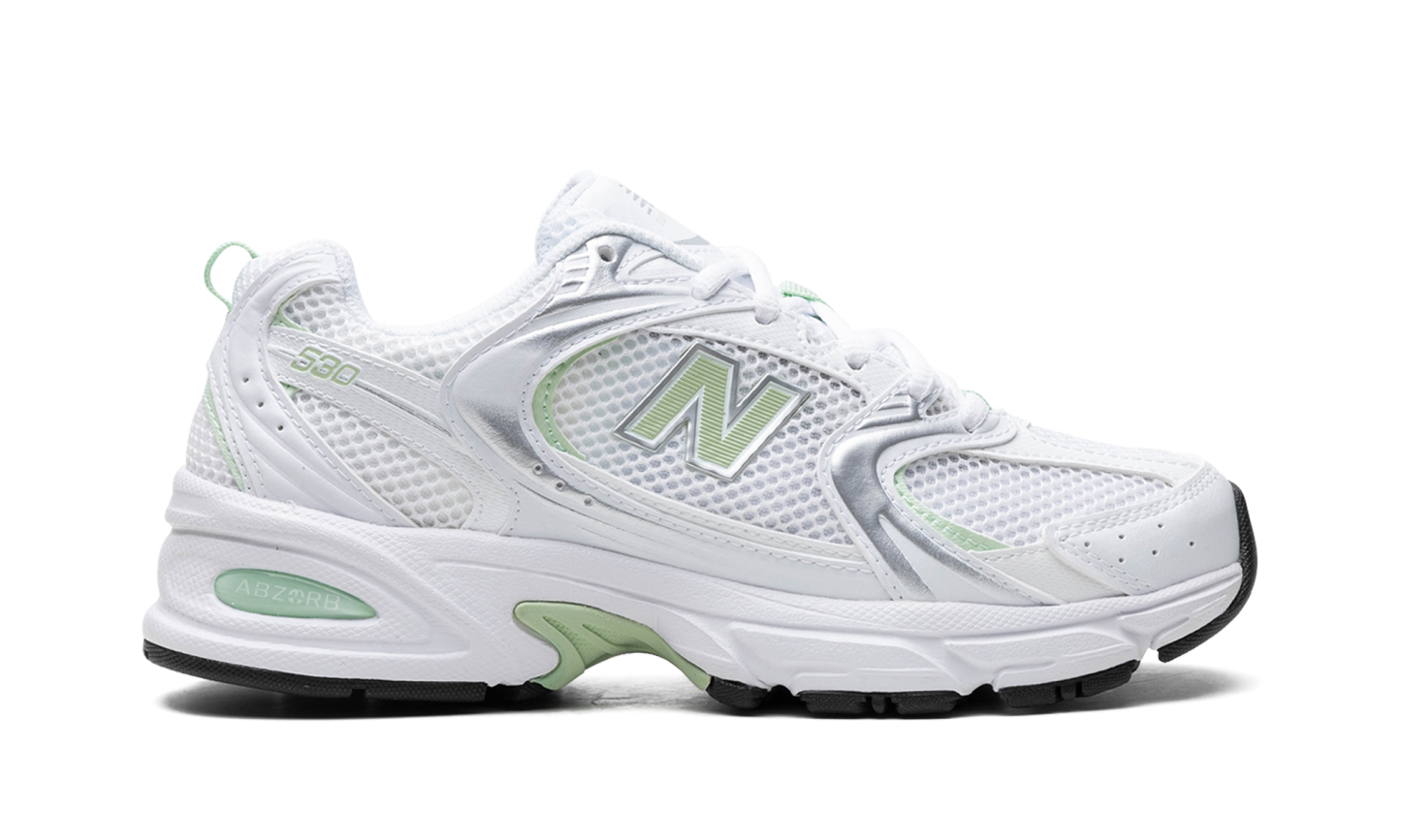 The New Balance 530 “Mint Green” is a colorway of the retro performance shoe with mint green features. The New Balance 530 was first released in 1992 by the Boston footwear company, and then it was reissued as part of the Y2K sneaker trend. The “Mint Green” features a white mesh base with a combination of silver synthetic and white leather overlays. A textured Mint Green “N” logo appears on both sides and a small Mint Green “530” detail is seen on the lateral side of the heel. Old school “New Balance” branding is found on the tongue. The chunky, white foam midsole features New Balance’s signature ABZORB cushioning for all-day comfort.