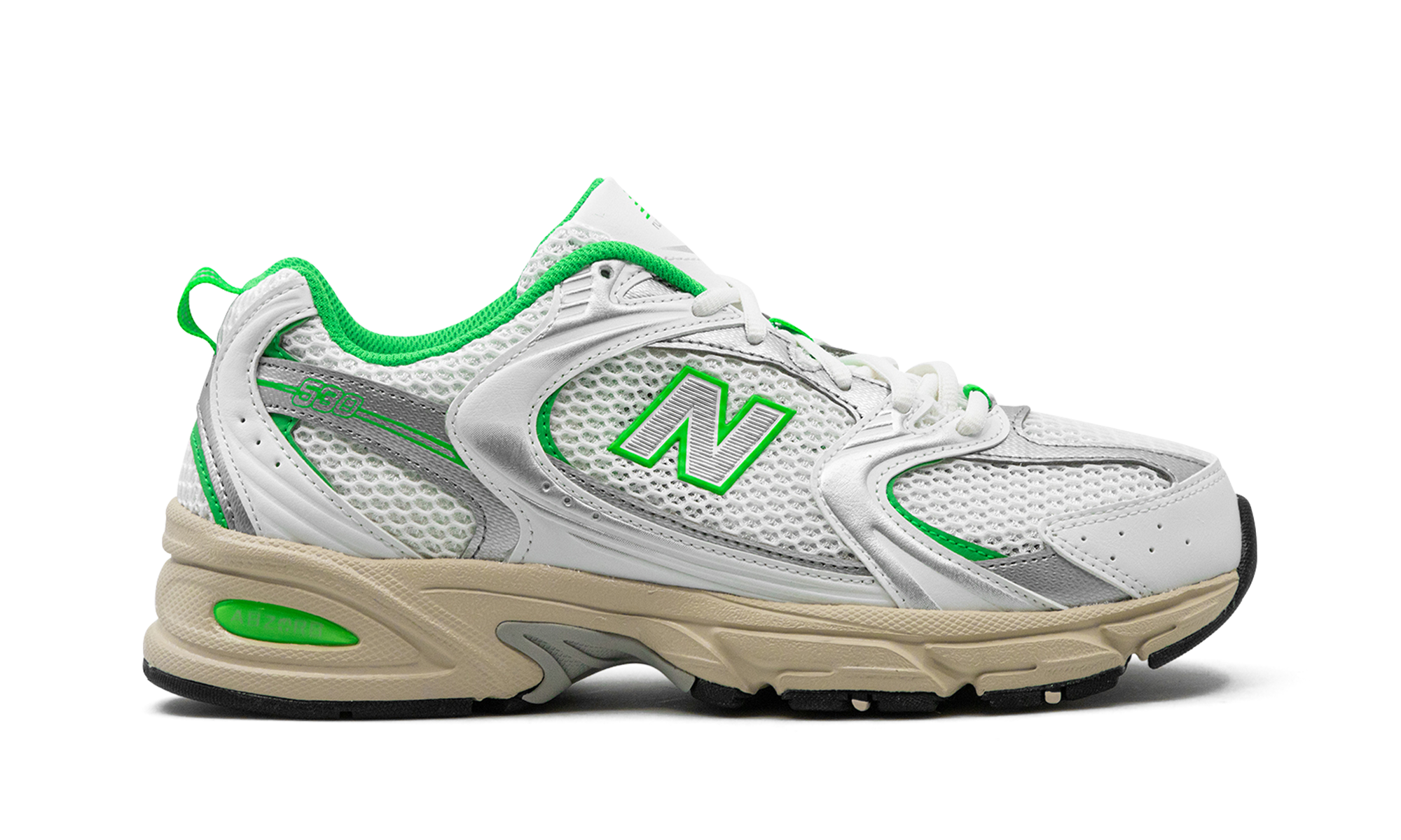 The New Balance 530 “White/Palm Leaf” is a colorway of the retro performance running and lifestyle shoe with aged details. Debuted in 1992, the New Balance 530 was originally a running shoe before transitioning into New Balance’s lifestyle category in the present day. The colorway at hand features a white open-mesh upper with metallic leather overlays accented in an eye-catching Palm Leaf hue. A white “N” with Palm Leaf-colored trim appears on the sides, while a “530” logo can be seen on the lateral side of the heel. Classic “NB” detailing is embroidered on the tongue. The shoe’s chunky midsole is given an aged look, and is equipped with New Balance’s signature ABZORB cushioning for all-day comfort.