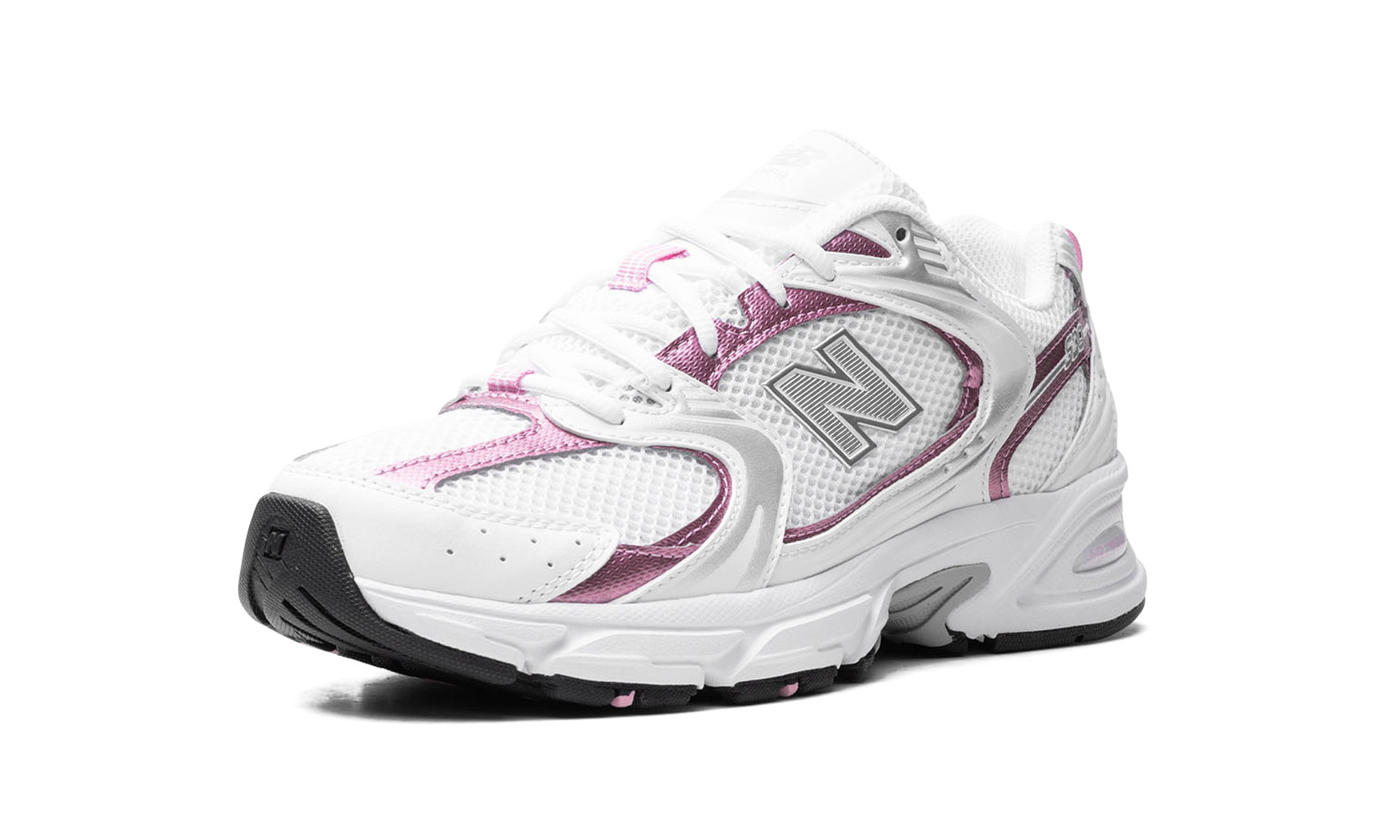 Discover the New Balance 530 "Pink Sugar," a retro running sneaker with eye-catching pink accents. This shoe features a white open-mesh construction contrasted with Pink Sugar synthetic leather overlays in a metallic finish, along with white and Metallic Silver overlays. An "NB" logo appears on the tongue, and a chunky white foam midsole completes the look. Originally released in 1992, the 530 returns as a stylish lifestyle shoe.