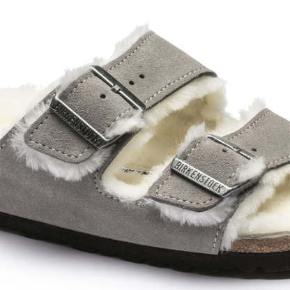 The legendary two-strap design from BIRKENSTOCK - the Arizona. Featured in genuine high-quality suede – and is now available in an extra cozy version thanks to a soft, bright genuine shearling lining on the anatomically formed cork-latex footbed and straps. These sandals are perfect for chilly, winter evenings.